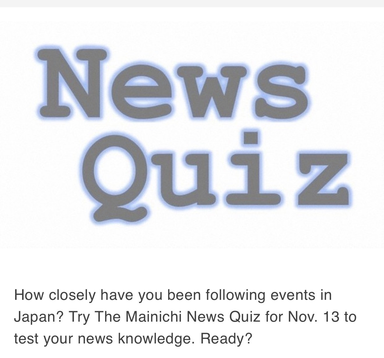 How closely have you been following events in Japan? Try The Mainichi News Quiz for Nov. 13 to test your news knowledge. Ready?