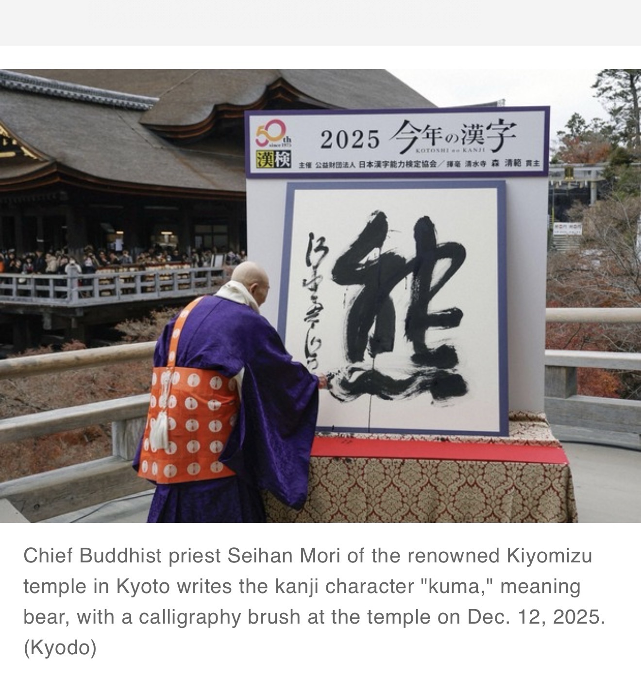 KYOTO (Kyodo) — The kanji for “kuma,” meaning bear, was picked as the single most representative Chinese character corresponding to the social mood in Japan this year, a Kyoto-based organization said Friday.